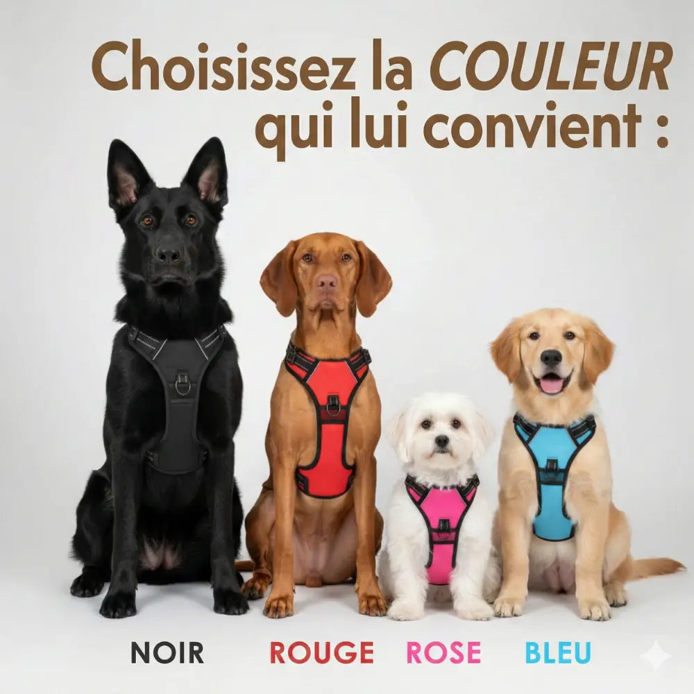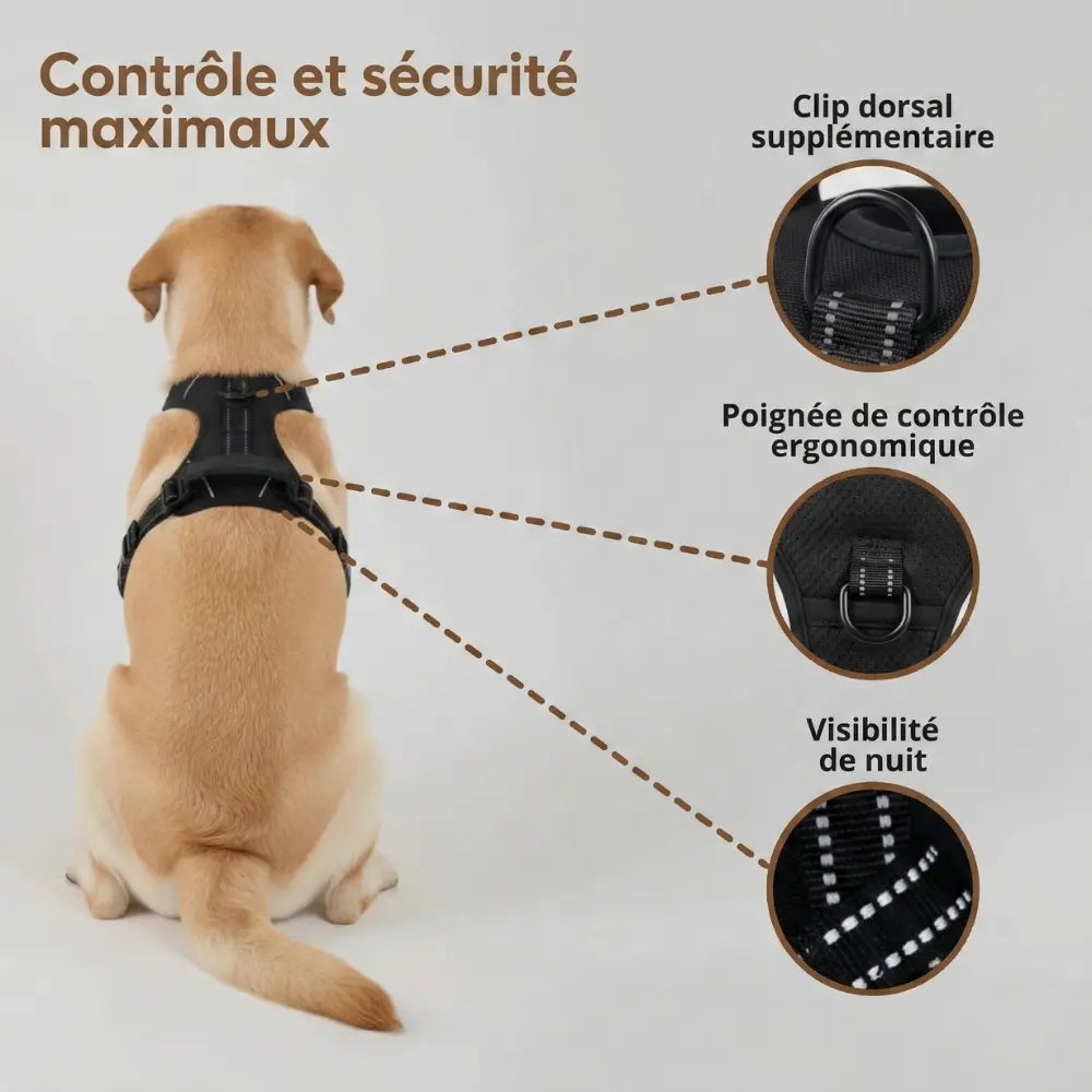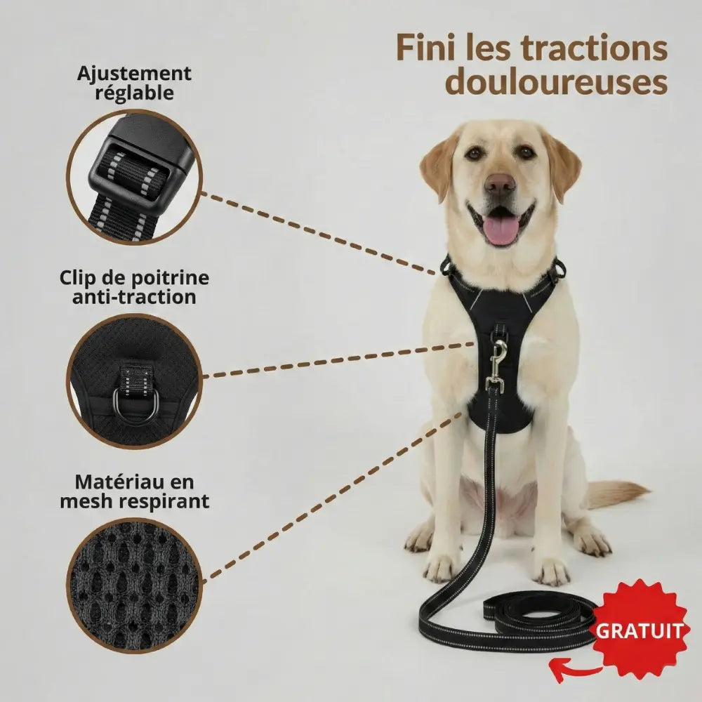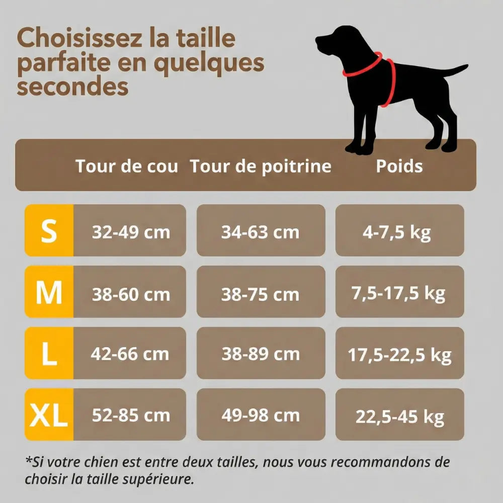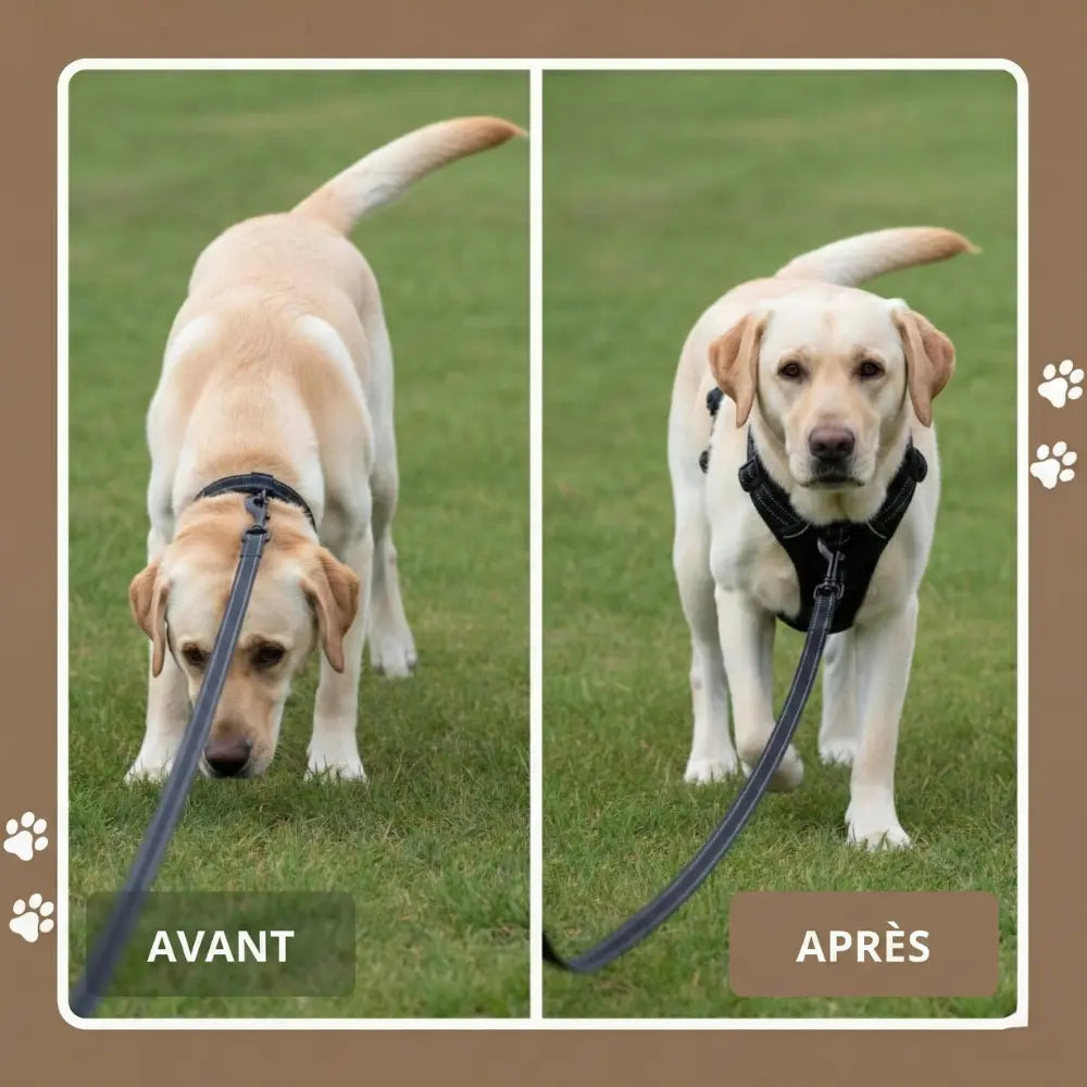 Un harnais répartit la traction sur une surface plus large, soulageant le cou et le dos de votre chien. Résultat : plus de sécurité, moins de risques de blessures et un meilleur contrôle, surtout pour les chiens en apprentissage.