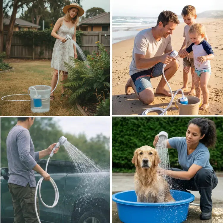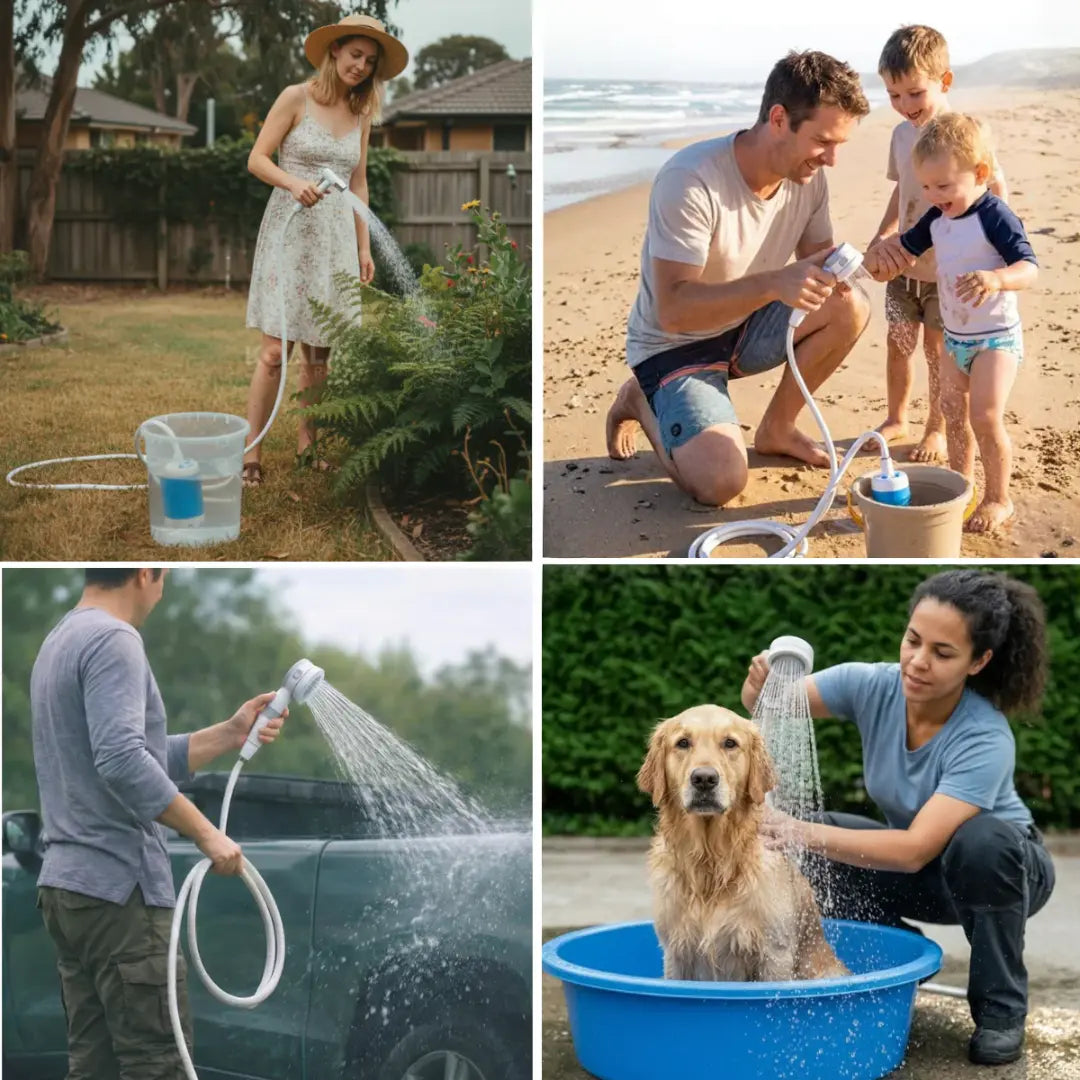 Découvrez la commodité et la polyvalence de notre pompe à eau portable multi-usages ! Parfaite pour une variété d'utilisations. Avec des embouts pour la douche, l'arrosage des plantes, le nettoyage / la serpillère, écoper le bateau, laver le chien et tout le reste.